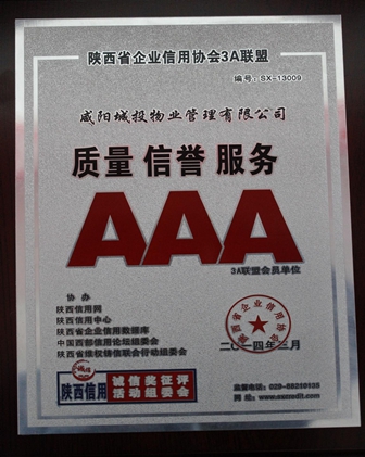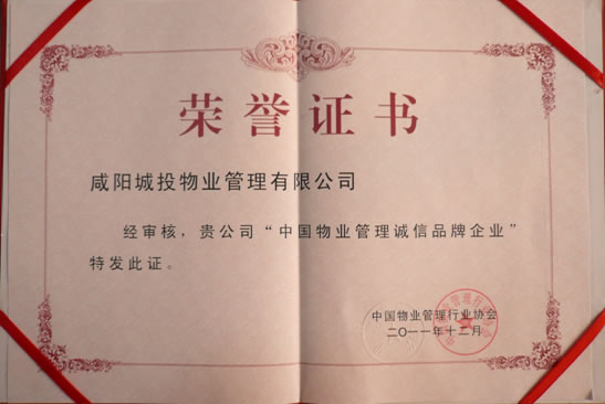 十年磨劍,劍成峰。2011年被中國物業(yè)管理行業(yè)協(xié)會授予中國物業(yè)管理誠信品牌企業(yè),2014年榮獲陜西省企業(yè)信用協(xié)會3A聯(lián)盟會員單位,2014年在國家園林城市創(chuàng)建工作中被咸陽市委、市政府評為“先進(jìn)基層單位”,2012年-2017年連續(xù)5年被上級工會授予“先進(jìn)集體”,2015年被共青團(tuán)咸陽市委授予“青年文明號”標(biāo)兵單位,2015-2017年連續(xù)3年被咸陽市扶貧協(xié)會授予“先進(jìn)集體”“會員單位”稱號,2017年度被咸陽市總工會授予“咸陽市模范職工之家”稱號。