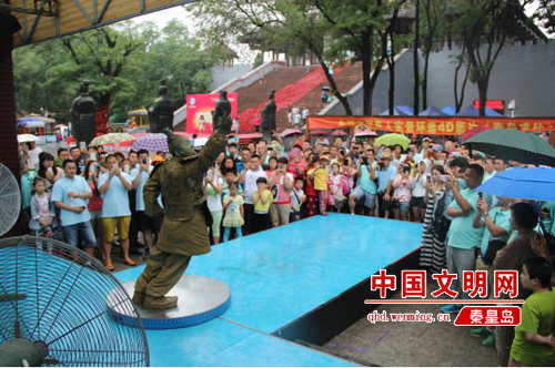 2016年7月7日,記者來到秦皇求仙入海處。在求仙殿廣場的東南方舞臺(tái),伴著富有節(jié)奏感的音樂響起,“泡泡大叔”的街舞表演準(zhǔn)時(shí)開始。他穿著皮質(zhì)的兵馬俑服裝,蹬著黑色軍靴,臉上涂滿灰色油彩。只見他雙腳不動(dòng),雙手舞動(dòng)前伸,身體前傾與地面成45度。固定幾十秒后,身體慢慢復(fù)位站直,又隨著音樂跳起了街舞。大約半個(gè)小時(shí)后,汗如雨下的“泡泡大叔”沖到電扇前吹風(fēng),一口氣喝下2瓶藿香正氣水,又跑回舞臺(tái)繼續(xù)表演。