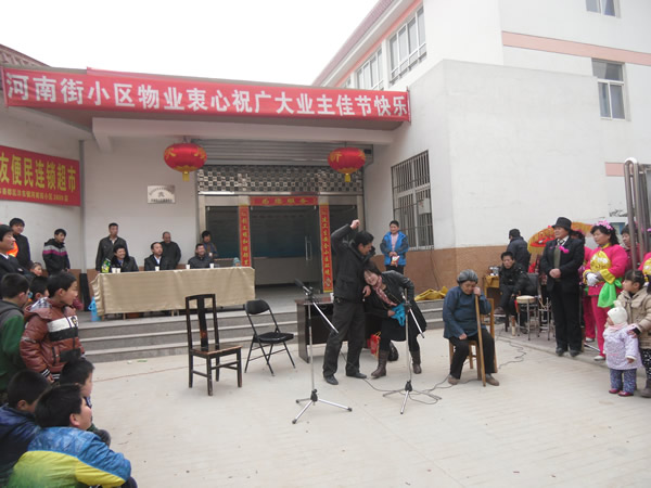。ㄐ畔T:李建華)農(nóng)歷正月十三(2月4日),河南街小區(qū)鑼鼓喧天,彩旗招展,熱鬧非凡,呈現(xiàn)出一片祥和的節(jié)日氣氛。 上午10時聯(lián)歡會準時開演,小區(qū)業(yè)主自編自演的腰鼓舞、扇子舞、拉開了這次活動的序幕,他們以優(yōu)美、歡暢的舞姿,以矯健穩(wěn)定的舞步,揮舞著手中的彩帶與鼓錘,生龍活虎,時伏時起。精彩的表演,贏得了在場觀眾的陣陣掌聲,尤其是小品《遲到的紅梅》將聯(lián)誼會逐漸推向了高潮,詼諧幽默地方話臺詞、真情再現(xiàn)的感情留露,深深的感染著在場的每一位觀眾。同時也讓我們清醒的認識到,尊老愛幼的傳統(tǒng)美德,無論在什么時候,我們都應該繼承與發(fā)揚,理解與關愛自己身邊的長輩與老人。 通過這次聯(lián)誼會,不但拉近與改善了物業(yè)與業(yè)主的關系,也活躍了小區(qū)精神文化生活,同時也體現(xiàn)了物業(yè)與小區(qū)業(yè)主都是一家人的魚水之情,鼓舞了物業(yè)辦全體員工繼續(xù)搞好小區(qū)各項工作的信心。